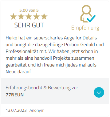 Alle meine Kunden konnten mit einer neuen Website und neuen Fotos Ihre Sichtbarkeit, die Wahrnehmung bei Ihren Kunden und dadurch auch Ihren Umsatz drastisch erhöhen!